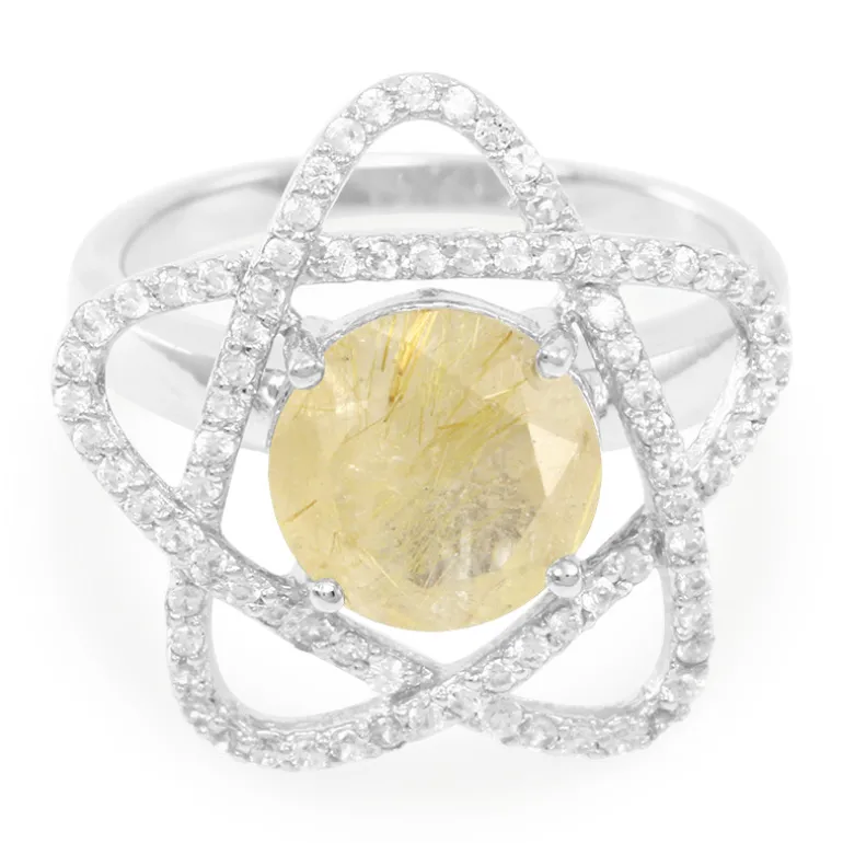 Entdecken Sie die Anziehungskraft dieses bezaubernden Rings aus Sterlingsilber, der einen brillanten Rutilquarz von 2,05 Karat aus Brasilien präsentiert. Sein außergewöhnlicher Rundschliff harmoniert mit dem filigranen 27×20 mm großen Ring, der mit 80 funkelnden Zirkonen aus Kambodscha verziert ist, die zusätzliche 0,54ct an Brillanz hinzufügen. Dieser Ring eignet sich perfekt, um jedem Ensemble einen Hauch von Raffinesse zu verleihen. Er ist ein hervorragender Gesprächsanlass und ein schillerndes Accessoire, das sowohl tagsüber als auch abends getragen werden kann.