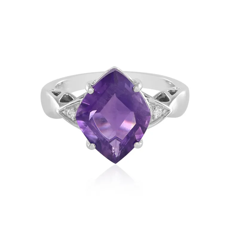 Dieser exquisite Ring aus 14-karätigem Gold mit einem strahlenden sambischen Amethysten von 3,99 Karat im Fantasieschliff, der im Licht tanzt, ist ein wahrer Luxus. Flankiert von zwei funkelnden SI2-Diamanten von insgesamt 0,02 ct, verkörpert dieses Stück Eleganz. Mit einem Gewicht von ca. 3,51 g in Gold und einer Größe von 23 x 21 mm ist das raffinierte Design ein Ausdruck purer Opulenz an Ihrem Finger. Dieser Ring eignet sich perfekt für Abendveranstaltungen oder als bezauberndes Geschenk und wird zu einem geschätzten Bestandteil jeder Schmucksammlung.