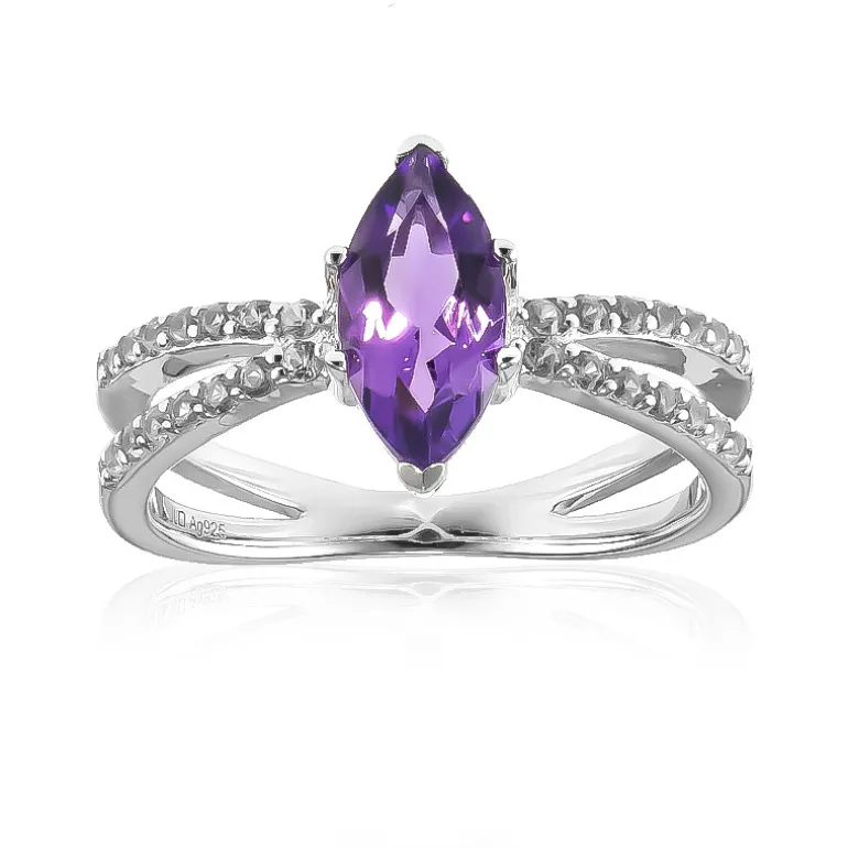 Entdecken Sie die Anziehungskraft dieses atemberaubenden Rings mit einem fesselnden sambischen Amethysten im Marquiseschliff von 0,86 Karat. Der Ring ist aus 925er Sterlingsilber gefertigt und wird von einem funkelnden kambodschanischen Zirkon von insgesamt 0,50 Karat akzentuiert. Der satte violette Farbton des Marquise-Edelsteins wird durch das schimmernde Zirkonband ergänzt und bildet eine perfekte Symphonie der Eleganz. Er ist ideal, um jedem Ensemble einen Hauch von Luxus zu verleihen und verspricht, bei jeder Veranstaltung für Gesprächsstoff zu sorgen.