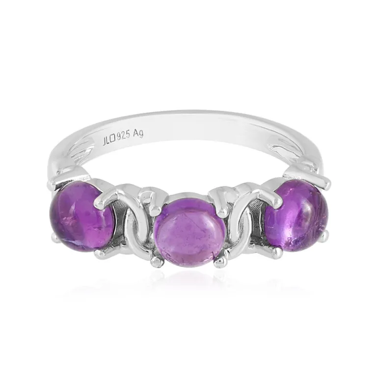 Entdecken Sie die Anziehungskraft dieses schicken, platinierten Rings aus Sterlingsilber mit einem Trio von bezaubernden Amethysten im Cabochon-Schliff, die aus den reichen Minen Sambias stammen. Jeder Edelstein, der insgesamt 1,461 Karat wiegt, liegt anmutig in der glänzenden Umarmung des Silbers und erzeugt bei jeder Bewegung ein bezauberndes Lichtspiel. Dieser Ring mit einem Gewicht von ca. 2,56 Gramm verbindet auf perfekte Weise moderne Eleganz mit zeitlosem Stil. Er ist ein vielseitiges Schmuckstück, das sowohl zu legerer Tageskleidung als auch zu formeller Abendgarderobe passt.