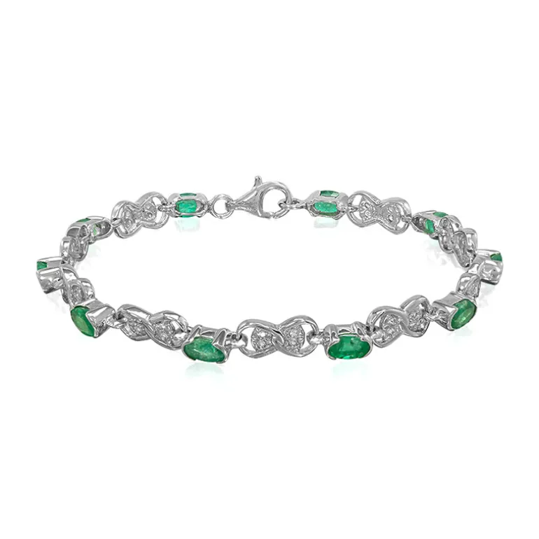 Dieses exquisite, aus 925er Sterlingsilber gefertigte Armband präsentiert die natürliche Schönheit sambischer Smaragde. Mit einem Gesamtgewicht von 4,335 Karat bietet dieses Schmuckstück zehn Smaragde im Ovalschliff, die von 36 strahlend weißen Saphiren ergänzt werden. Dieses elegante und vielseitige Armband ist ein umwerfendes Accessoire für formelle Anlässe und den Luxus des Alltags. Kombinieren Sie dieses 19 cm lange Armband mit Ihrem Lieblingskleid, um jeden Look aufzuwerten.