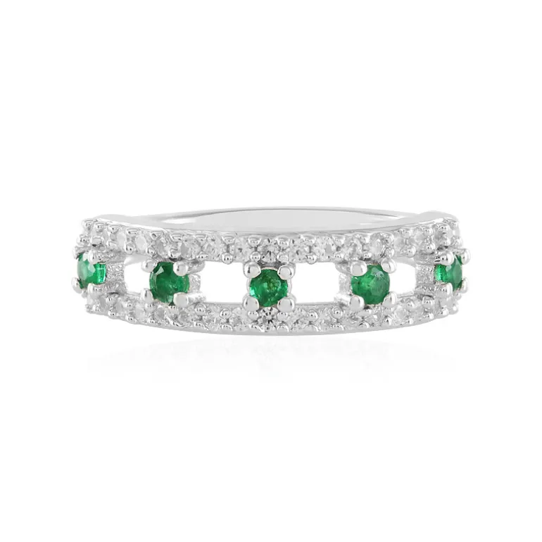 Wir präsentieren unseren exquisiten Ring mit lebhaften Smaragden aus Sambia, ergänzt durch funkelnde Zirkon-Akzente aus Kambodscha. Der Ring ist aus feinem 925er Sterling Silber gefertigt und hat ein Gesamtkaratgewicht von 0,594 ct. Die Smaragde im Rundschliff bilden zusammen mit den glitzernden Zirkonen ein harmonisches Spiel aus Licht und Farbe. Dieser Ring eignet sich sowohl für die Freizeit als auch für formelle Anlässe und verleiht jedem Outfit einen Hauch von Eleganz. Ob als aufmerksames Geschenk oder als persönliche Aufmerksamkeit, dieser elegante Ring wird mit Sicherheit in Ehren gehalten werden.
