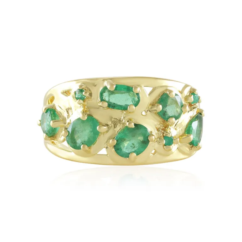 Dieser elegante Ring präsentiert eine schillernde Reihe von sambischen Smaragden mit einem Gesamtgewicht von 1,458 ct. Das Design aus vergoldetem 925er Sterlingsilber umfasst Steine im Oval-, Tropfen- und Rundschliff für einen fesselnden Look. Dieses Schmuckstück ist perfekt für Abendveranstaltungen und verleiht jedem Outfit einen Hauch von Raffinesse. Kombinieren Sie es mit einem klassischen schwarzen Kleid für einen zeitlosen, eleganten Auftritt.