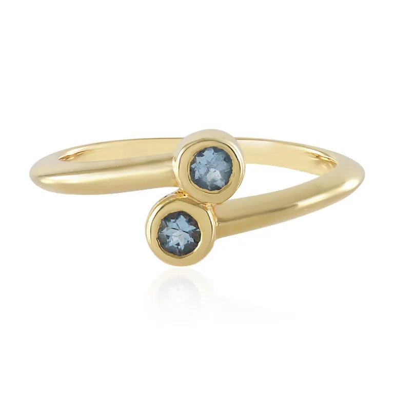 Dieser elegante Ring besteht aus einem Paar Santa-Maria-Aquamarinen von insgesamt 0,174 Karat aus den üppigen Ländern Brasiliens. Jeder Stein ist meisterhaft rund und brillant geschliffen, mit einem Durchmesser von etwa 3 mm, um die ozeanischen Farbtöne zu maximieren. Das Band aus 925er Sterlingsilber, das liebevoll vergoldet wurde, wiegt etwa 2,26 g. Das offene Design verleiht dem klassischen Stil eine moderne Note und macht es vielseitig tragbar, sei es für den Alltag oder als Geschenk für eine besondere Person.