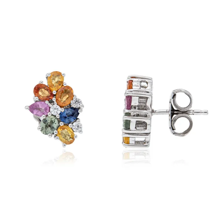 Entdecken Sie die lebendige Anziehungskraft dieser Ohrringe aus 925er Sterlingsilber, die mit einer Kaskade von mehrfarbigen Saphiren aus Madagaskar und Thailand mit einem Gesamtgewicht von 2,795 ct geschmückt sind. Jeder Ohrring besteht aus einer kunstvollen Anordnung von ovalen und tropfenförmigen rosa und blauen Saphiren, die mit funkelnden Zirkonen aus Tansania akzentuiert sind. Die brillanten Farbtöne und der gekonnte Schliff sorgen bei jeder Drehung für einen strahlenden Glanz. Diese Ohrringe eignen sich perfekt, um Ihrem Tageslook einen Farbtupfer zu verleihen oder ein Abendoutfit aufzuwerten. Sie sind eine vielseitige Ergänzung für jede Schmucksammlung.