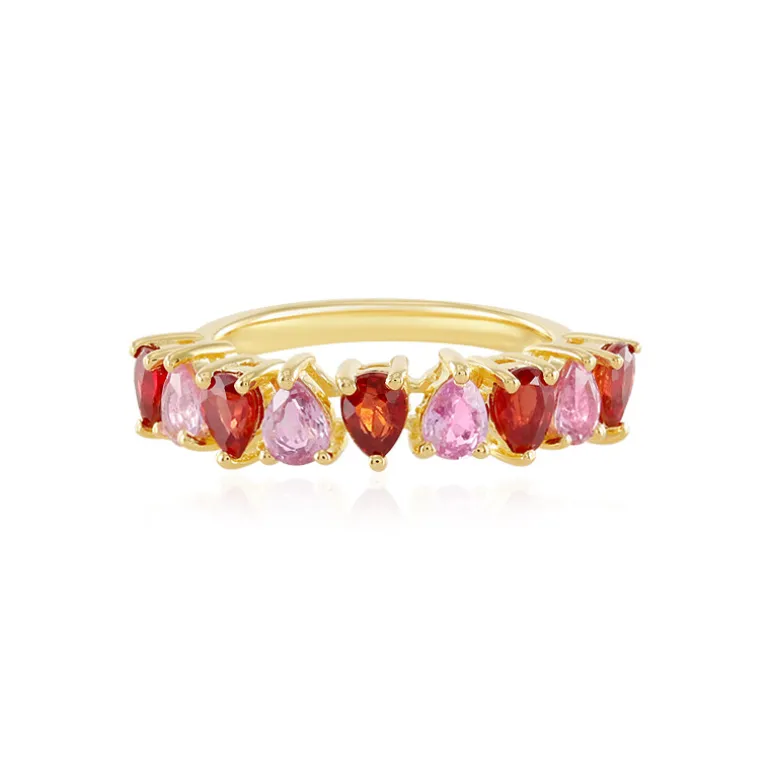Dieser bezaubernde Ring präsentiert ein Spektrum aus leuchtend rosa und sonnenuntergangsblauen Saphiren aus Madagaskar und Tansania. Die Edelsteine im Tropfenschliff mit einem Gesamtgewicht von 1,705 Karat sind fachmännisch in ein vergoldetes Band aus 925er Sterlingsilber gefasst, das Langlebigkeit und einen Hauch von Eleganz garantiert. Sein vielseitiges Design macht ihn zu einer reizvollen Ergänzung für das tägliche Tragen oder besondere Anlässe. Mit diesem bezaubernden Schmuckstück können Sie mühelos ein Freizeitoutfit aufwerten oder einer Abendgarderobe den letzten Schliff verleihen.