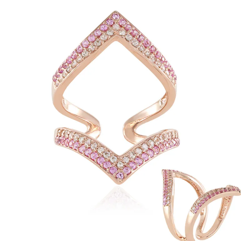 Lassen Sie sich von den zarten Farben des Frühlings verzaubern mit diesem Ring im Chevron-Stil, der mit 50 rosafarbenen Ceylon-Saphiren (0,625 ct) aus Sri Lanka und 46 strahlend weißen Saphiren (0,446 ct) aus Madagaskar besetzt ist. Der Ring aus 925er Sterlingsilber mit zarter Roségoldplattierung wiegt etwa 4,66 Gramm und hat ein Gesamtgewicht von 1,071 Karat. Die einzigartige Chevron-Form verleiht dem Ring eine moderne Note und macht ihn zu einer herausragenden Wahl für jede moderne Schmucksammlung. Der Ring ist ideal für ein legeres Brunch oder eine elegante Abendveranstaltung und lässt sich problemlos mit pastellfarbenen oder neutralen Outfits kombinieren. Zelebrieren Sie besondere Momente mit diesem einzigartig gestalteten Schmuckstück.
