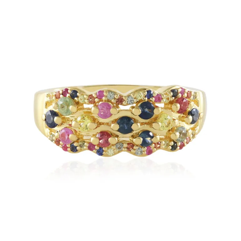 Entdecken Sie die Anziehungskraft dieses mehrfarbigen Saphirrings mit einer Vielzahl von blauen, rosafarbenen, orangefarbenen, grünen und gelben Saphiren aus Madagaskar und Thailand. Der Ring ist aus vergoldetem 925er Sterlingsilber gefertigt und strahlt Eleganz aus. Es eignet sich sowohl für formelle Anlässe als auch für Freizeitaktivitäten und kann sowohl zu einem schicken Kleid als auch zu Alltagskleidung getragen werden, um Ihrem Look einen farblichen Akzent zu verleihen.