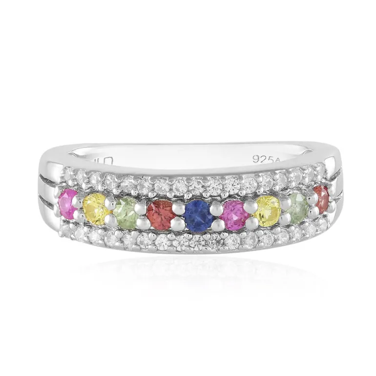 Erleben Sie einen Farbrausch mit diesem bezaubernden Multicolor-Saphirring, der mit einer Reihe von rosa, blauen, gelben, grünen und orangen Saphiren besticht. Der Ring ist aus glänzendem 925er Sterlingsilber gefertigt und mit schillernden Zirkonsteinen besetzt. Er verleiht jedem Outfit einen Hauch von Eleganz. Er eignet sich sowohl für legere als auch für formelle Anlässe und lässt sich wunderbar mit einfarbigen Outfits kombinieren, um seine Farben zum Leuchten zu bringen.