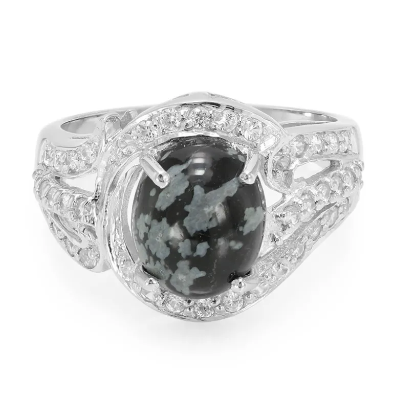 Entdecken Sie die bezaubernde Anziehungskraft dieses Rings aus Schneeflocken-Obsidian mit einem 3,19-karätigen Edelstein im ovalen Cabochon-Schliff, eingefasst in hochwertiges 925er Sterlingsilber. Das komplizierte Design wird durch 41 schillernde Zirkone aus Kambodscha vervollständigt, die ein Funkeln erzeugen, das an eine Winternacht erinnert. Dieser Ring ist ebenso vielseitig wie schön und eignet sich perfekt, um Ihrer Abendgarderobe einen raffinierten Touch zu verleihen oder ein auffälliges Statement zu Ihrem Alltagsoutfit abzugeben.