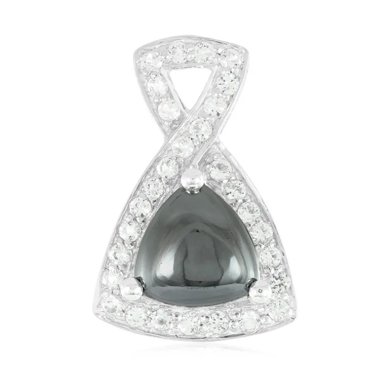 Entdecken Sie den Reiz der monochromen Eleganz mit diesem schicken Silberanhänger aus schwarzem Hämatit und weißem Topas. Ein schwarzer Hämatit im Trillant-Cabochon-Schliff von 6,17 Karat aus den USA, umhüllt von 29 funkelnden brasilianischen weißen Topasen von insgesamt 0,803 Karat, bildet einen raffinierten Kontrast. Dieser aus feinem 925er Sterlingsilber gefertigte Anhänger mit einem Gesamtgewicht von 6,973 ct ist ein Statement des raffinierten Geschmacks. Sein einzigartiges Design, bei dem das glänzende Silber die dunklen Farbtöne des Hämatits ergänzt, macht ihn zu einem idealen Accessoire sowohl für formelle als auch für legere Anlässe und sorgt für einen anmutigen Auftritt bei jeder Veranstaltung.