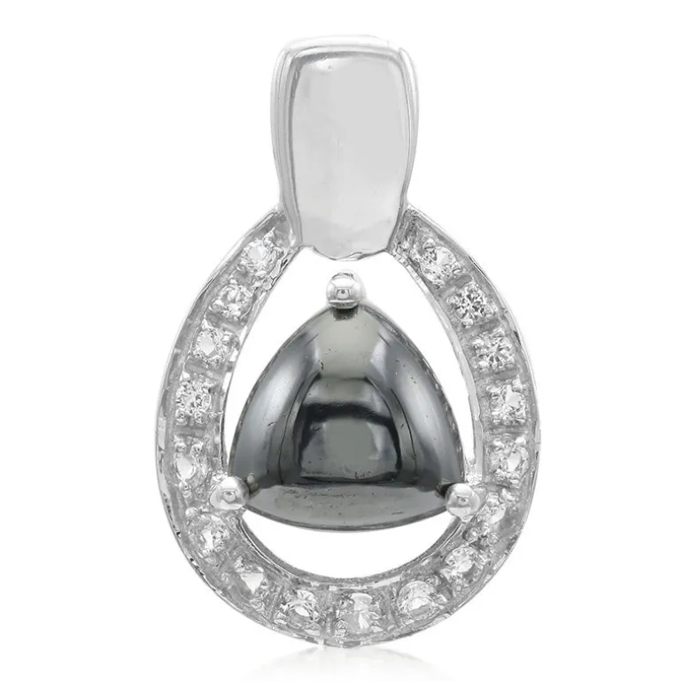 Dieser Anhänger ist ein modernes Meisterwerk mit einem auffälligen schwarzen Hämatit-Cabochon von 6,7 Karat aus den USA, der in einer trillianten Form geschliffen ist und Raffinesse ausstrahlt. Flankiert von 17 brasilianischen weißen Topasen von insgesamt 0,365 ct, gefasst in glänzendem 925er Sterlingsilber, misst dieses Stück elegante 26 x 16,5 mm. Ein vielseitiges Accessoire, das sowohl zur Freizeit- als auch zur Abendgarderobe passt und bei jeder gesellschaftlichen Veranstaltung für Gesprächsstoff sorgen wird.
