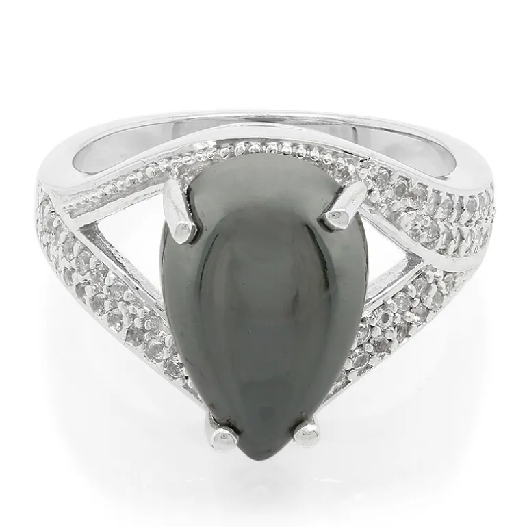 Lassen Sie sich von der dunklen Anziehungskraft dieses Rings aus schwarzem Hämatit verzaubern, der mit einem glänzenden 8,07-karätigen tropfenförmigen Cabochon aus den USA besetzt ist. Eingefasst in 925er Sterlingsilber und umgeben von 47 funkelnden weißen Topasen aus Brasilien mit einem Gesamtgewicht von 0,27 Karat, bietet dieser Ring einen fesselnden Kontrast. Das schlanke Silberband mit einem Gewicht von ca. 4,08 g ergänzt die tiefen Töne des Hämatits und macht ihn zu einem vielseitigen Accessoire für formelle und legere Anlässe. Erweitern Sie Ihre Schmucksammlung mit diesem auffälligen Stück, das Raffinesse mit einem Hauch von Nervosität verbindet.