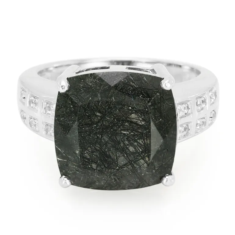 Schmücken Sie Ihren Finger mit der geheimnisvollen Anziehungskraft dieses Ringes aus brasilianischem schwarzem Rutilquarz. Der 6,88 Karat schwere, antike Edelstein im Kissenschliff ist meisterhaft in ein Band aus poliertem 925er Sterlingsilber gefasst, das von einem funkelnden weißen Topas akzentuiert wird. Mit seinem faszinierenden Geflecht aus nadelartigen Einschlüssen wird dieses einzigartige Schmuckstück Aufmerksamkeit und Komplimente auf sich ziehen. Es eignet sich perfekt, um jeder Abendgarderobe einen Hauch von raffinierter Eleganz zu verleihen oder bei zwanglosen Anlässen ein gewagtes Statement abzugeben.