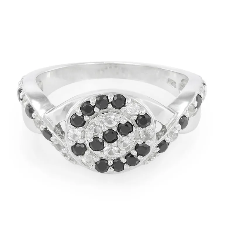 Dieser auffällige Ring besticht durch runde schwarze Spinelle aus Thailand im Brillantschliff mit einem Gesamtgewicht von 0,69 Karat, die kunstvoll zu einem schillernden Mittelstück angeordnet sind. Ergänzt wird der tiefe Glanz der Spinelle durch 16 strahlend weiße Saphire aus Madagaskar, die zusätzlich 0,494 Karat an Glanz hinzufügen. Der fachmännisch in poliertes 925er Sterlingsilber gefasste Ring wiegt etwa 3,42 Gramm, misst 26 x 26 mm und strahlt Eleganz aus. Er ist ideal für die Abendgarderobe oder besondere Anlässe und passt hervorragend zu schicker, einfarbiger Kleidung oder als Statement-Stück zu bunten Outfits.