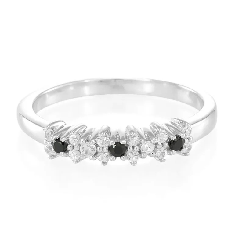 Dieser auffällige Ring präsentiert den harmonischen Kontrast von drei schwarzen Thai-Spinellen und vierzehn weißen Madagaskar-Saphiren, gefasst in hochwertigem 925er Sterlingsilber. Die runden Steine im Brillantschliff haben zusammen ein Gewicht von 0,297 Karat und sind sorgfältig so angeordnet, dass sie das Licht einfangen und ein funkelndes Feld auf einem schlanken Silberband bilden. Dieses Schmuckstück ist ideal, um jedem Outfit einen Hauch von Raffinesse zu verleihen und eignet sich sowohl für den Alltag als auch für besondere Anlässe.