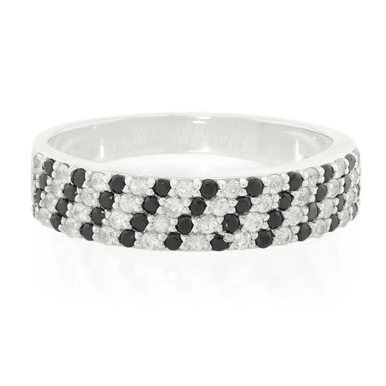 Schmücken Sie Ihren Finger mit dieser eindrucksvollen Mischung aus monochromer Majestät und funkelnder Raffinesse. Dieser Ring besteht aus 37 schwarzen Spinellen im Brillantschliff aus Thailand und 37 weißen Saphiren im Brillantschliff aus Madagaskar mit einem Gesamtkaratgewicht von 0,843 ct. Das in hochwertigem 925er Sterlingsilber gefasste Schmuckstück wiegt etwa 2,6 g und misst 25 x 25 mm. Dieses Band ist sowohl für den Tag als auch für den Abend geeignet und ergänzt Ihre Garderobe mit seinem auffälligen, kontrastreichen Muster und zeitlosen Design.
