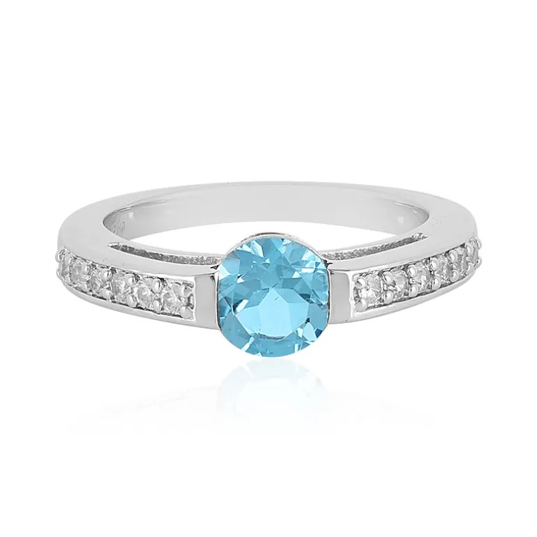 Entdecken Sie die ruhige Schönheit dieses Schweizer Blautopasrings mit einem atemberaubenden Edelstein von 0,97 Karat aus Madagaskar. Umgeben von funkelnden Zirkonen aus Kambodscha mit einem Gesamtgewicht von 0,239 ct, ist jeder Stein sorgfältig rund geschliffen, um seinen strahlenden Glanz zu verstärken. Der Ring aus platiniertem 925er Sterlingsilber wiegt ca. 2,81 g und bietet ein harmonisches Gleichgewicht aus Eleganz und Haltbarkeit. Das schlichte Design des Rings macht ihn zu einer vielseitigen Ergänzung jedes Ensembles, ob für zwanglose Ausflüge oder besondere Anlässe.