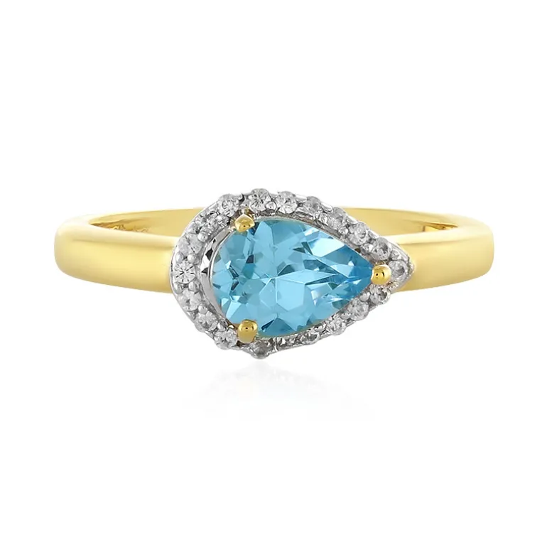 Dieser Ring aus vergoldetem 925er Sterling Silber besticht durch einen 0,747 Karat großen brasilianischen Blautopas im Birnenschliff, der von einem Kranz funkelnder kambodschanischer Zirkone umgeben ist. Der Kontrast zwischen dem leuchtend blauen Edelstein und der Vergoldung sorgt für ein klassisches und doch auffälliges Erscheinungsbild, das sich sowohl für legere Ausflüge als auch für formelle Anlässe eignet. Dieses schicke Stück verkörpert Raffinesse und ist eine vielseitige Ergänzung für jede Schmucksammlung.
