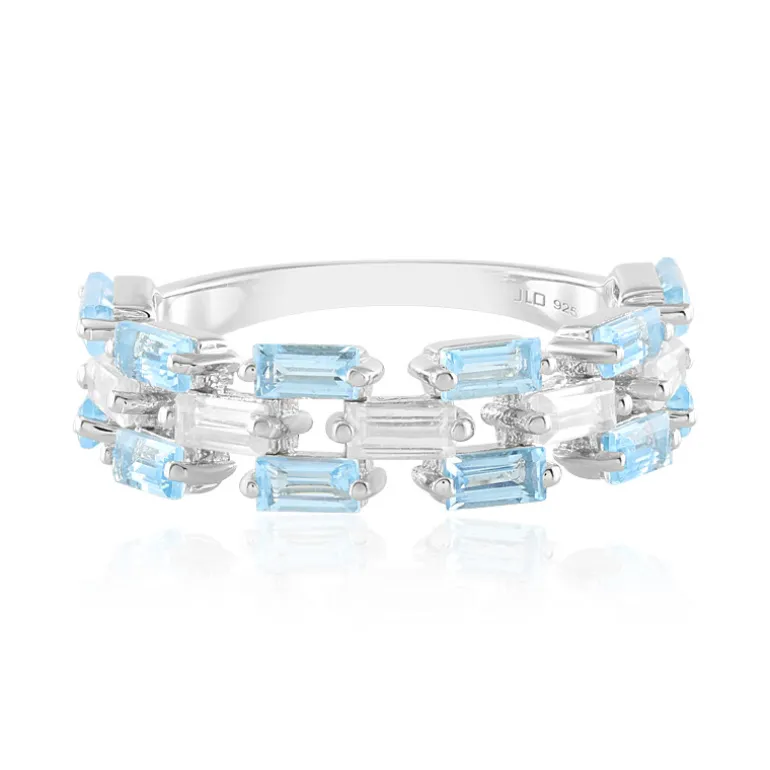 Dieser schimmernde Ring besteht aus 12 Schweizer Blautopasen im Baguetteschliff, die neben 5 funkelnden Zirkonen in einer glänzenden Fassung aus platiniertem Sterlingsilber eingebettet sind. Das einzigartige Stufendesign schafft eine moderne Gitteranordnung, die die eisblauen Farbtöne von insgesamt 2,412 Karat hervorhebt. Dieser bezaubernde Ring mit seiner luftigen Eleganz ist ideal, um sowohl Tages- als auch Abendoutfits einen Hauch von Raffinesse zu verleihen.