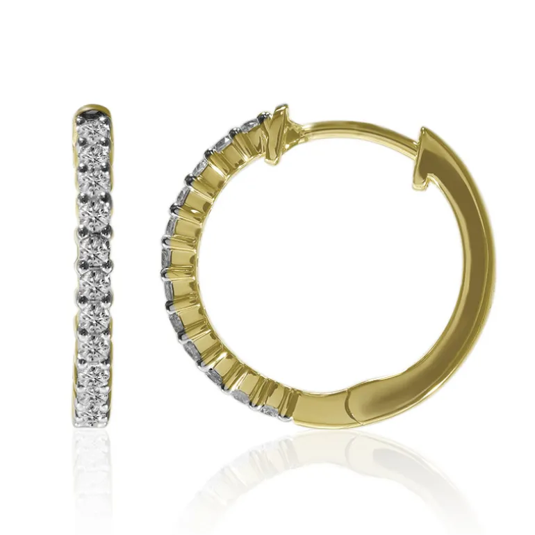 Diese anmutigen und leuchtenden Creolen sind ein raffinierter, funkelnder Kreis mit 24 Diamanten der Reinheit SI1 von insgesamt 0,336 Karat. Jeder Diamant ist sorgfältig in glänzendes 9-karätiges Gold mit einem Gewicht von etwa 2,58 Gramm gefasst. Der Durchmesser von 16 mm sorgt für eine elegante Präsenz, ohne aufdringlich zu wirken, und eignet sich sowohl für das tägliche Tragen als auch für besondere Anlässe. Diese Ohrringe werten mühelos jedes Ensemble auf, vom schicken Business-Look bis zum Abendkleid.