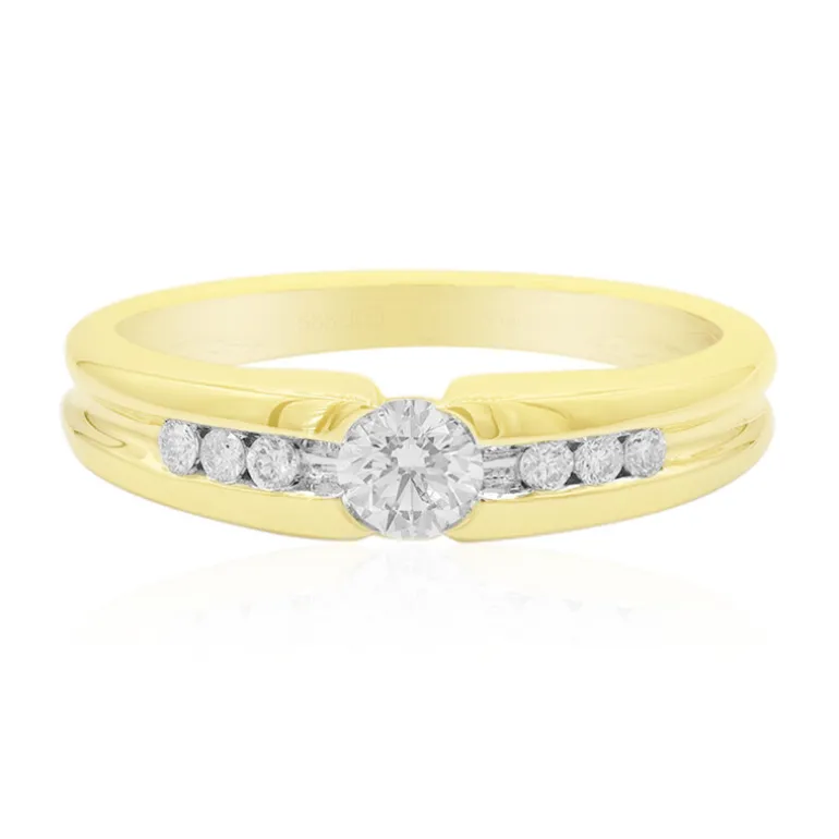 Lassen Sie sich von der zeitlosen Eleganz dieses Rings aus Chic 585 Gold verzaubern. Der zentrale Diamant mit einem Reinheitsgrad von 0,245ct SI1 wird von sechs weiteren Diamanten mit einem Gesamtgewicht von 0,084ct umrahmt, die zusammen 0,329ct ergeben. Der in Deutschland aus 3,13 g hochwertigem Gold gefertigte Ring mit rundem Brillantschliff glänzt bei jeder Drehung. Dieser Ring eignet sich perfekt für die Verlobung oder als luxuriöses Geschenk. Er passt sowohl zur Tages- als auch zur Abendgarderobe und verleiht jedem Ensemble einen Hauch von Raffinesse.