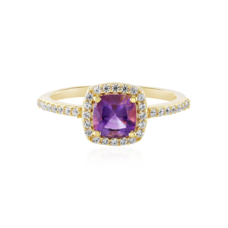 Lassen Sie sich vom königlichen Charme dieses vergoldeten Rings aus Sterlingsilber verzaubern, dessen Herzstück ein sibirischer Amethyst im Kissenschliff aus Russland ist. Der violette Edelstein von 0,755 Karat besticht durch seinen Antikschliff, umgeben von einem Halo aus 36 kambodschanischen Zirkonen von insgesamt 0,342 Karat. Das zeitlose Design dieses Rings macht ihn zu einem idealen Accessoire sowohl für formelle Anlässe als auch für die Eleganz des Alltags. Kombinieren Sie ihn mit pastellfarbenen oder neutralen Tönen, damit der tiefe Amethyst-Farbton schön zur Geltung kommt.