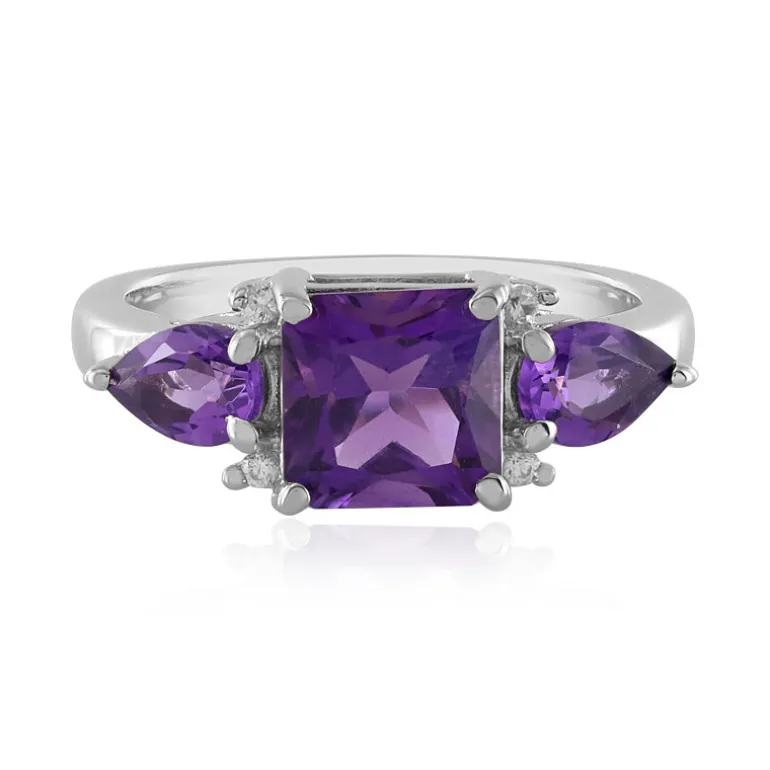 Entdecken Sie die Anziehungskraft russischer Eleganz mit diesem exquisiten sibirischen Amethystring, der mit 2,07 ct. reichhaltig gefärbten Edelsteinen besetzt ist. Das aus hochwertigem 925er Sterlingsilber gefertigte und mit Platin überzogene Schmuckstück zeigt einen zentralen achteckigen Strahlenschliff, der von birnenförmigen Amethysten flankiert und von funkelnden kambodschanischen Zirkonen akzentuiert wird. Dieser Ring ist ideal, um jeder Abendgarderobe einen Hauch von Raffinesse zu verleihen. Er ist ein wahres Zeugnis für zeitlosen Stil und Handwerkskunst.