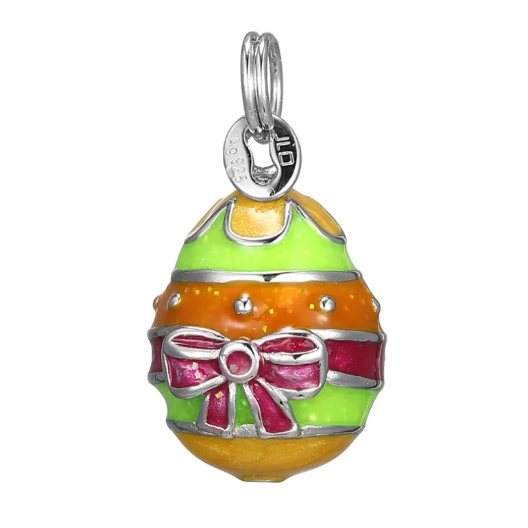 Genießen Sie die Freude der Saison mit diesem skurrilen Anhänger aus 3,02 g hochwertigem 925er Sterlingsilber. Dieses farbenfrohe Accessoire hat die Form eines festlichen Eies und ist mit einem Schleifenmotiv verziert, das jedem Ensemble einen verspielten und doch eleganten Charme verleiht. Die leuchtenden Emaille-Farbtöne in Grün, Orange und Rosa sowie die funkelnden Silberelemente machen es zu einer auffälligen Ergänzung Ihrer Schmucksammlung. Er eignet sich perfekt für Festtage oder als fröhliches Geschenk und verleiht jedem Outfit einen Hauch von Farbe und Freude.