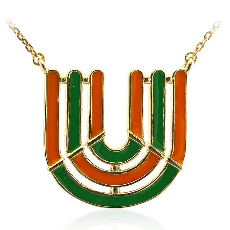 Dieses exquisite Stück fängt mit seinen geometrischen Linien und kräftigen Farbkontrasten den Geist des Art déco ein. Gefertigt aus hochwertigem 925er Sterlingsilber und mit einer glänzenden Vergoldung veredelt, ist diese Halskette elegant und modern zugleich. Der Anhänger hängt elegant an einer 45,5 cm langen Kette, die sich sowohl mit legerer als auch mit formeller Kleidung kombinieren lässt. Die Orange- und Grüntöne verleihen jedem Outfit einen frischen Farbakzent und sorgen dafür, dass Sie überall ein raffiniertes Statement abgeben.