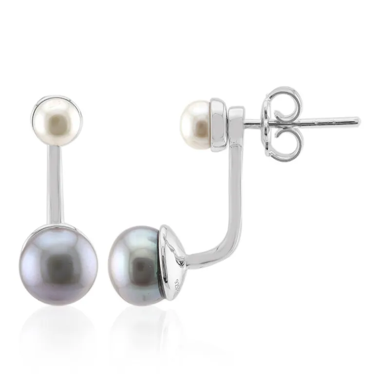 Diese raffinierten zweifarbigen Süßwasserperlen-Ohrringe sind ein wahres Zeugnis zeitloser Eleganz. Das aus hochwertigem 925er Sterlingsilber gefertigte Paar besteht aus zwei sich ergänzenden Farbtönen glänzender Perlen, die von Chinas besten Perlenfarmen stammen. Die größere graue 8-mm-Perle baumelt anmutig, während die kleinere weiße 5-mm-Perle eng am Ohrläppchen sitzt. Mit etwa 3 Gramm Silber bieten diese Ohrringe sowohl Haltbarkeit als auch Raffinesse. Sie sind ein ideales Accessoire für den Alltag und für besondere Anlässe und passen sowohl zur Geschäftskleidung als auch zur Abendgarderobe.
