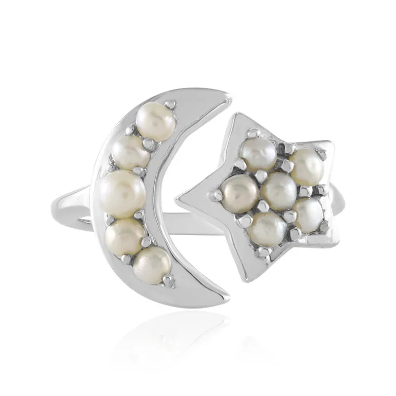 Umarmen Sie den Kosmos mit diesem himmlischen Perlenring aus Sterlingsilber, der mit exquisiten Süßwasserperlen aus China besetzt ist. Dieser Ring in Form eines Mondes und eines Sterns ist eine perfekte Mischung aus Eleganz und Laune. Er eignet sich sowohl für zwanglose Ausflüge als auch für Abendveranstaltungen und passt sowohl zu minimalistischer als auch zu aufwändigerer Kleidung und verleiht Ihrem Ensemble einen Hauch von Sternenstaub.