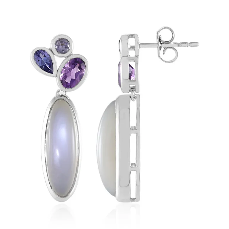 Entdecken Sie die Eleganz dieser exquisiten Silberohrringe mit indischen Mondsteinen in einem fesselnden ovalen Cabochon. Akzentuiert durch funkelnde brasilianische Amethyste, tansanische Tansanite und madagassische Iolithen bieten sie eine harmonische Farbmischung. Perfekt für Abendveranstaltungen oder als raffinierte Ergänzung zu Alltagsoutfits. Ein außergewöhnliches Geschenk aus der KM by Juwelo Kollektion.