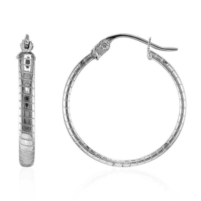 Genießen Sie die zeitlose Eleganz unserer Chic Sterling Silver Hoop Earrings. Die aufwendig gefertigten Ohrringe aus hochwertigem 925er Sterlingsilber mit dezentem Strukturfinish und einem Gewicht von ca. 1,9 Gramm sind der Inbegriff von raffinierter Schlichtheit. Sie eignen sich perfekt, um Ihrem Alltagslook einen Hauch von Glanz zu verleihen oder Ihre Abendgarderobe aufzuwerten. Ihre Größe von 20 mm bietet eine reizvolle Präsenz, ohne aufdringlich zu sein. Kombinieren Sie diese vielseitigen Creolen mit einer eleganten Hochsteckfrisur, um einen raffinierten Effekt zu erzielen, oder lassen Sie sie Ihre Freizeitkleidung mit müheloser Anmut ergänzen.