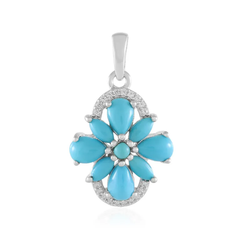 Dieser exquisite Anhänger zeigt strahlenden Dornröschen-Türkis aus den USA, kunstvoll arrangiert in einem fesselnden Blumendesign. Er ist mit funkelnden Zirkonen aus Kambodscha verziert und in elegantem 925er Sterlingsilber gefertigt. Dieses Schmuckstück eignet sich perfekt, um Ihrer Alltagskleidung oder besonderen Anlässen einen Hauch von Raffinesse zu verleihen und ergänzt sowohl legere als auch formelle Kleidung.