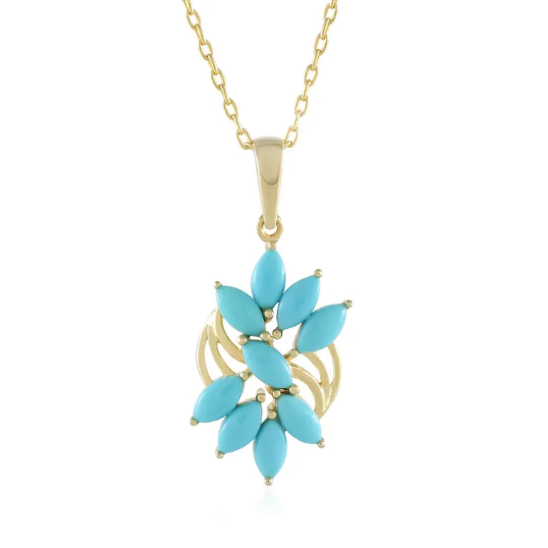 Dieser exquisite Anhänger ist mit neun Marquise-Cabochon-Edelsteinen in Dornröschen-Türkis besetzt, die für ihren leuchtend blauen Farbton bekannt sind. Eingefasst in elegantes, vergoldetes 925er Sterlingsilber, bietet das Design eine harmonische Mischung aus modernem Stil und zeitloser Schönheit. Mit einem Gesamtgewicht von 1,46 ct passt er sowohl zu legeren als auch zu formellen Outfits und verleiht jedem Anlass einen Hauch von Eleganz.