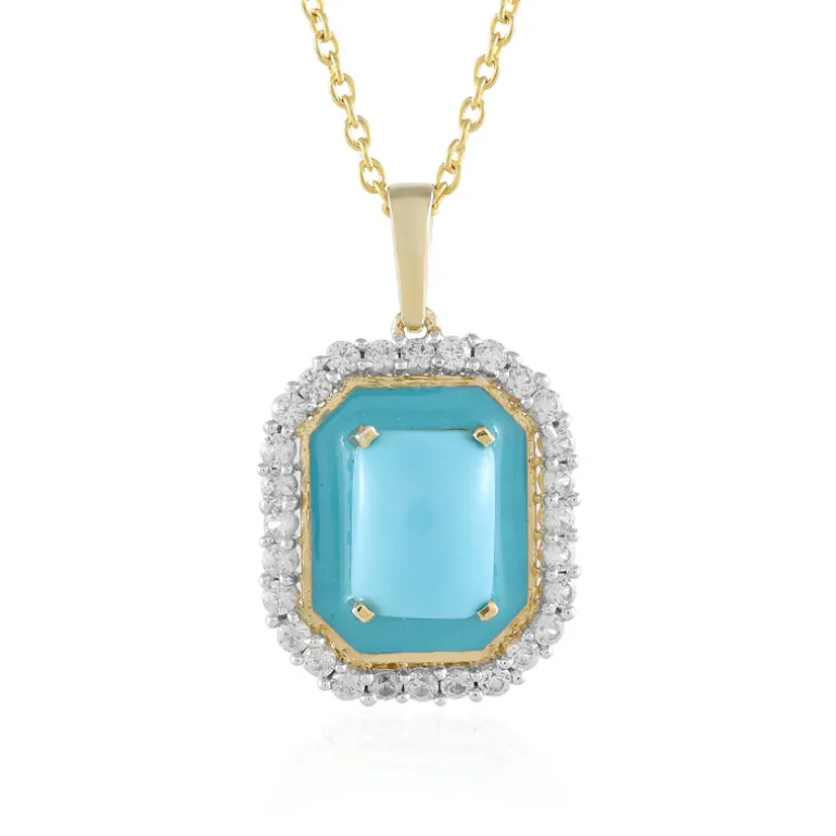 Entdecken Sie diesen exquisiten Anhänger mit einem bezaubernden Dornröschen-Türkis aus den USA, umrahmt von funkelnden Zirkonen aus Kambodscha. Der achteckige Cabochon erzeugt zusammen mit den Zirkonen einen atemberaubenden visuellen Effekt in diesem vergoldeten Stück aus 925er Sterlingsilber. Ideal für legere und formelle Anlässe. Kombinieren Sie es mit einem eleganten Kleid oder einer klassischen Bluse, um Ihren Look aufzuwerten.