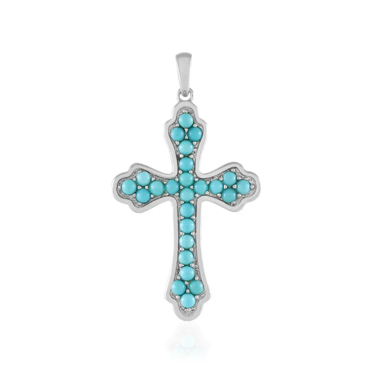 Erleben Sie die Anziehungskraft von 25 Dornröschen-Türkisen, die in Sterlingsilber gefasst sind und einen atemberaubenden Anhänger bilden. Diese runden Cabochons aus den USA bieten 1,53 ct schillernde Schönheit, perfekt für jede Gelegenheit. Egal, ob Sie ein Freizeitoutfit aufwerten oder Ihre Abendgarderobe aufwerten möchten, dieser Anhänger besticht durch seine Eleganz und sein einzigartiges Kreuzdesign, das ihn zu einer vielseitigen Ergänzung Ihrer Schmucksammlung macht.