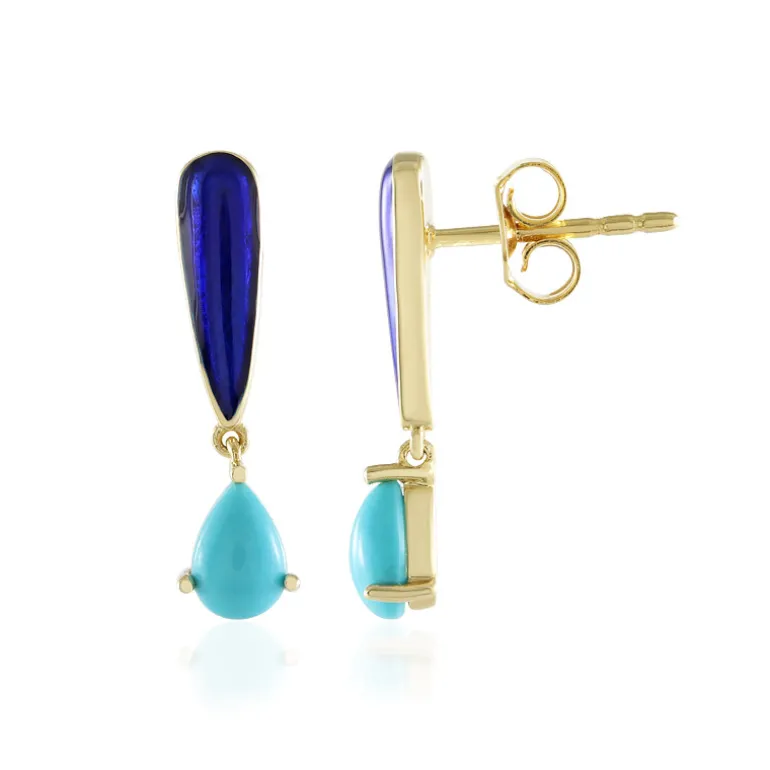 Entdecken Sie die Eleganz dieser Sleeping Beauty Türkis-Ohrringe mit zwei tropfenförmigen Cabochons, die aus den USA stammen. Sie sind aus 925er Sterlingsilber mit luxuriösem Vermeil-Finish gefertigt, wiegen 1,45 g und haben ein Gesamtkaratgewicht von 0,81 ct. Die 20 mm großen Ohrringe sind perfekt, um jedem Outfit einen Hauch von Raffinesse zu verleihen und passen sowohl zur Freizeit- als auch zur Abendgarderobe.
