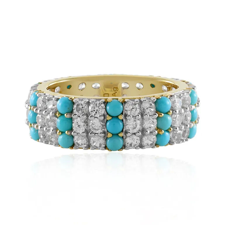 Dieser schicke Ring aus vergoldetem 925er Sterlingsilber mit 30 runden Cabochons aus Dornröschen-Türkisen und 60 schimmernden Zirkonen aus Kambodscha ist ein Symbol der Gelassenheit, umgeben von Ausgelassenheit. Mit einem Gesamtkaratgewicht von 3,78 ct bietet dieser Ring ein harmonisches Gleichgewicht aus himmelblauen Farbtönen und funkelnder Transparenz. Er ist ein vielseitiges Schmuckstück, das ein legeres Business-Outfit aufhellt oder Ihrer Abendgarderobe einen Farbakzent verleiht.