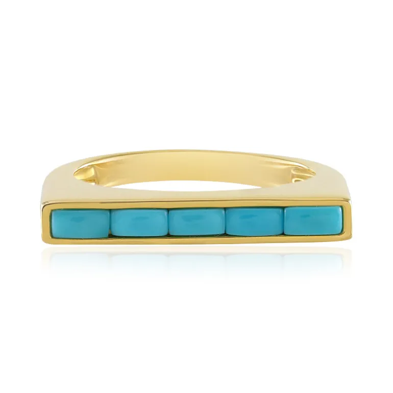 Unser schicker Dornröschen-Türkisring strahlt mit seiner eleganten Reihe von Baguette-Cabochons, die aus den USA stammen, Raffinesse aus. Dieser exquisite Schmuck besteht aus 0,59 Karat Türkisen, die in ein glänzendes Band aus 925er Sterlingsilber mit Goldplattierung gefasst sind und etwa 2,37 Gramm wiegen. Der ruhige blaue Farbton des Türkises kontrastiert wunderschön mit dem warmen Goldton und macht ihn zu einem idealen Accessoire für den Tag und die Nacht. Dieser Ring eignet sich perfekt, um einem neutralen Ensemble einen farbigen Akzent zu verleihen oder einen Bohème-Look zu ergänzen. Er ist vielseitig genug, um bei jeder Gelegenheit als Statement-Stück zu dienen.