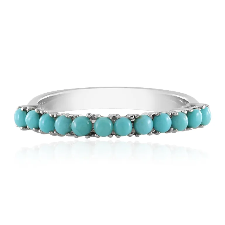 Entdecken Sie das erfrischende Blau des amerikanischen Dornröschen-Türkises mit diesem eleganten Ring aus 925er Sterlingsilber. Jeder der 12 runden Cabochon-Türkissteine von insgesamt 0,432 Karat ist für Langlebigkeit plattiert und bietet einen leuchtenden Farbakzent. Dieses Schmuckstück verleiht legeren Anlässen einen Hauch von Eleganz oder verleiht besonderen Anlässen einen Hauch von Farbe. Es passt ideal zu einem Sommerkleid oder einem klassischen weißen Hemd und ist eine vielseitige Ergänzung für jede Schmucksammlung.