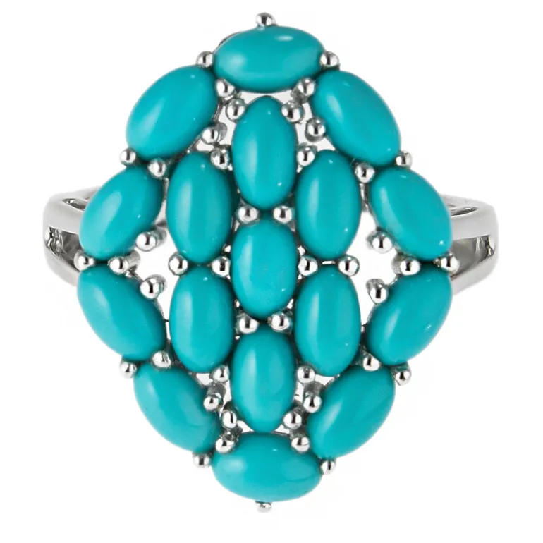 Zelebrieren Sie zeitlose Eleganz mit diesem schicken Dornröschen-Türkis-Silberring. Mit 17 ovalen Cabochon-Türkis-Edelsteinen aus den USA von insgesamt 4,59 Karat, gefasst in poliertem 925er Sterlingsilber mit einem Gewicht von ca. 2,65 g. Das Clustermuster hat eine Größe von 23 x 21 mm und ist ein kühner, aber raffinierter Blickfang. Dieser Ring eignet sich sowohl für einen legeren Brunch als auch für eine elegante Abendveranstaltung. Er zieht die Blicke auf sich und sorgt für Gesprächsstoff, wo immer Sie hingehen.