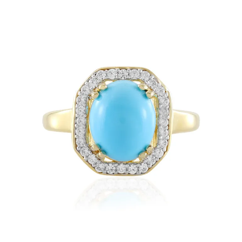 Dieser bezaubernde Ring präsentiert einen atemberaubenden ovalen Türkis im Cabochon-Schliff mit einem Gewicht von 2,268 Karat, der aus den renommierten Minen in den USA stammt. Eingerahmt von funkelnden kambodschanischen Zirkonen im Rundschliff mit einem Gesamtgewicht von 0,342 Karat ist der leuchtend blaue Edelstein das Herzstück dieses exquisiten Schmuckstücks. Gefertigt aus 925er Sterlingsilber mit einer luxuriösen Goldplattierung, verleiht dieser Ring jedem Outfit einen Hauch von Raffinesse. Ob für einen legeren Brunch oder eine Abendveranstaltung, er ist ein vielseitiges Schmuckstück, das mit seinem ruhigen, azurblauen Farbton besticht.