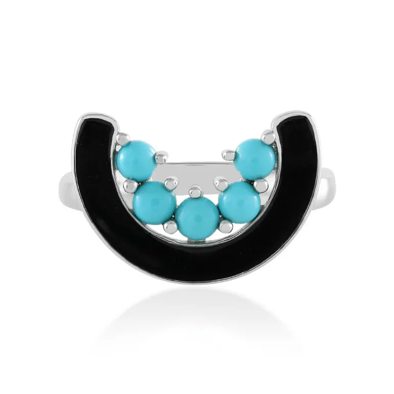 Entdecken Sie die Faszination des Sleeping Beauty Türkis Silberrings. Mit fünf atemberaubenden runden Cabochon-Türkis-Edelsteinen aus den USA, bietet dieser Ring ein Gesamtkaratgewicht von 0,59 ct. Das 925er Sterlingsilber ist für zusätzlichen Glanz plattiert und ergänzt die leuchtenden blauen Farbtöne. Perfekt für einen schicken Tageslook oder ein elegantes Abendensemble, ist er eine vielseitige Ergänzung für jede Schmucksammlung.
