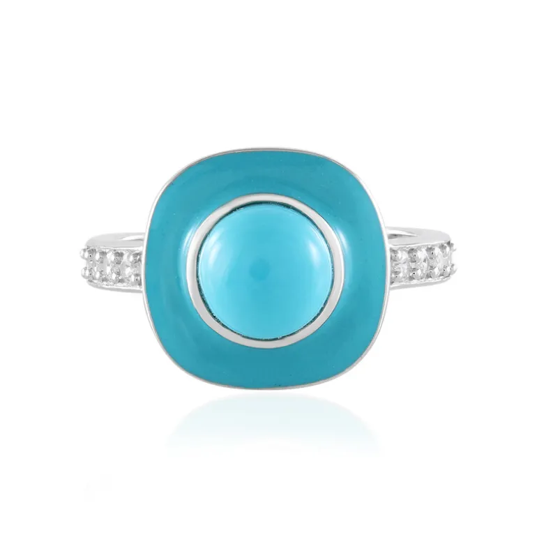 Entdecken Sie den lebendigen Charme des Türkis-Cabochon-Sterlingsilberrings. Der 1,22-karätige Dornröschen-Türkis strahlt Eleganz aus und wird durch kambodschanische Zirkon-Akzente ergänzt. Der aus 925er Sterlingsilber gefertigte Ring ist ideal, um Ihrer Alltagskleidung oder besonderen Anlässen einen farbigen Akzent zu verleihen. Kombinieren Sie ihn mit lässigen oder formellen Outfits für einen fesselnden Look.