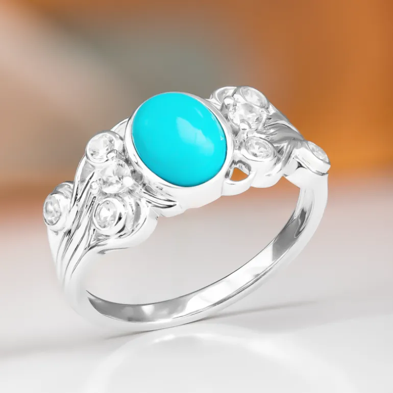 Entdecken Sie Eleganz mit diesem exquisiten Ring aus Dornröschen-Türkis, der einen atemberaubenden ovalen Cabochon von 1,26 Karat aus den USA enthält. Das mit funkelnden Zirkonen aus Kambodscha geschmückte Stück aus platiniertem 925er Sterlingsilber wiegt 2,12 g und hat ein Gesamtkaratgewicht von 1,71 ct. Perfekt für legere und formelle Anlässe. Kombinieren Sie ihn mit Ihrer Lieblingskleidung und verleihen Sie ihr einen Hauch von Raffinesse und Charme.