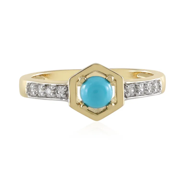 Entdecken Sie die lebendige Anziehungskraft dieses vergoldeten Rings aus Sterlingsilber mit einem bezaubernden 0,27-karätigen Dornröschen-Türkis aus den USA, der in eine elegante sechseckige Lünette gefasst ist. Der runde Cabochon-Schliff des Türkis bringt seine leuchtende Farbe zur Geltung und ist von der berühmten Mine in Arizona inspiriert. Flankiert von funkelnden kambodschanischen Zirkon-Akzenten von insgesamt 0,144 ct. versprüht dieses Schmuckstück klassischen Charme mit einem modernen Touch. Dieser Ring ist perfekt geeignet, um Ihrer Berufskleidung einen farbigen Akzent zu verleihen oder einen schicken Freizeitlook zu unterstreichen. Er bringt ein Stück südwestliche Schönheit direkt an Ihre Fingerspitzen.