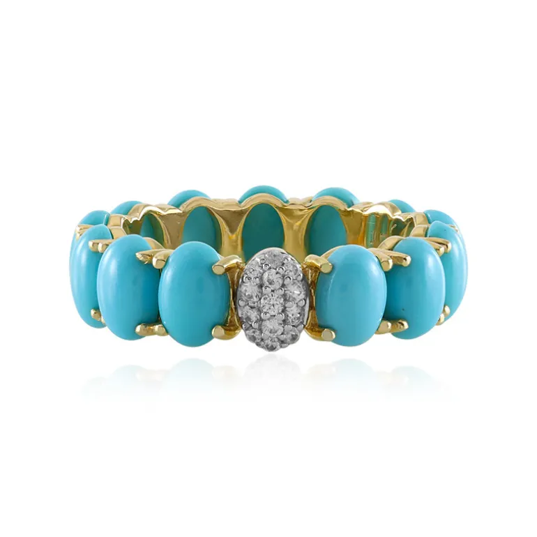 Genießen Sie die ruhige Schönheit dieses exquisiten Rings mit dem berühmten Dornröschen-Türkis aus den USA, der durch funkelnde Zirkon-Akzente aus Kambodscha ergänzt wird. Die leuchtenden 5,27ct Türkis-Edelsteine sind kunstvoll in einer polierten ovalen Cabochon-Fassung arrangiert und machen dieses Stück zu einer herausragenden Ergänzung jeder Schmucksammlung. Dieser Ring aus 925er Sterlingsilber mit einer prächtigen Goldplattierung schmiegt sich elegant an Ihren Finger und lässt sich perfekt mit weißen Sommerkleidern oder einem eleganten Abendkleid kombinieren. Setzen Sie mit diesem atemberaubenden Schmuckstück einen farbigen und eleganten Akzent.