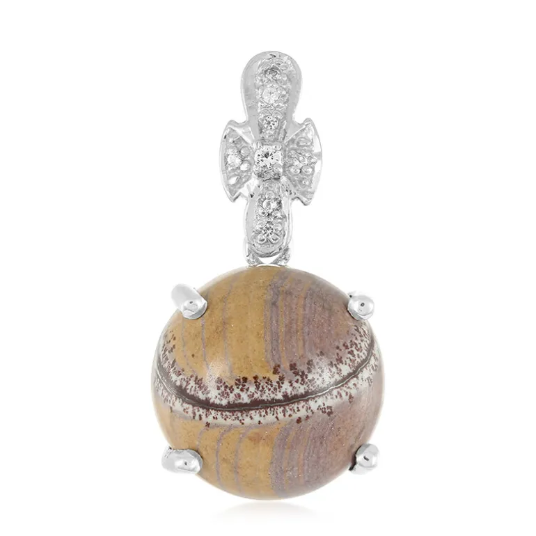 Entdecken Sie die Faszination dieses atemberaubenden Anhängers aus 925er Sterlingsilber mit Sonora Dendritic Jasper. Mit einem runden Cabochon-Jaspis von 8,27 Karat aus Mexiko und weißen Topas-Akzenten aus Brasilien strahlt dieses Stück natürliche Eleganz aus. Er eignet sich sowohl für legere als auch für formelle Anlässe und verleiht jedem Look einen Hauch von Raffinesse. Ideal für besondere Anlässe oder als unverwechselbares Stilmerkmal.